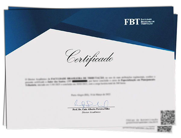 Os certificados possuem o selo de qualidade da Faculdade Brasileira de Tributação, que é reconhecida pelo MEC.
